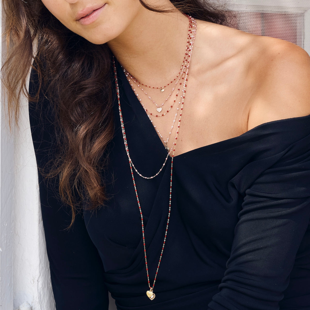 Photo du décolleté d’une femme portant différents colliers Gigi Clozeau.