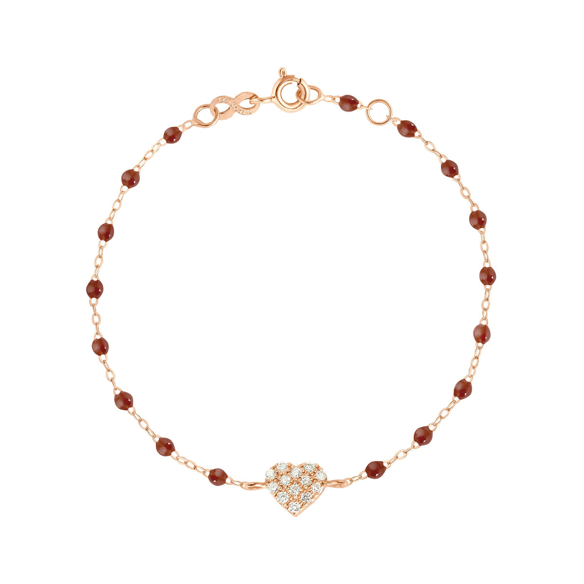 Pulsera de oro rosa de 18 quilates con cuentas de resina moka. Motivo de corazón ligeramente curvado con 13 diamantes engastados.