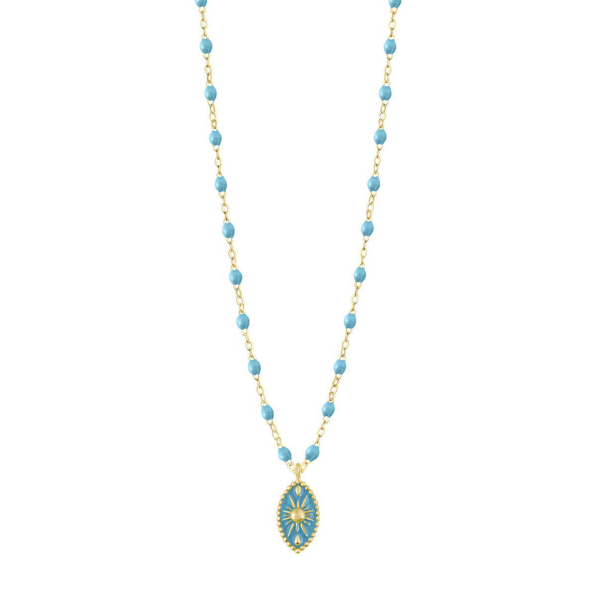 El Collar Karma Gigi Clozeau en oro amarillo 18 quilates se revela sur la cadena clásica Gigi, adornada con elegantes perlas de resina turquoise. Su colgante, con un contorno finamente perlado, encarna un talismán precioso, a la vez protector y luminoso.